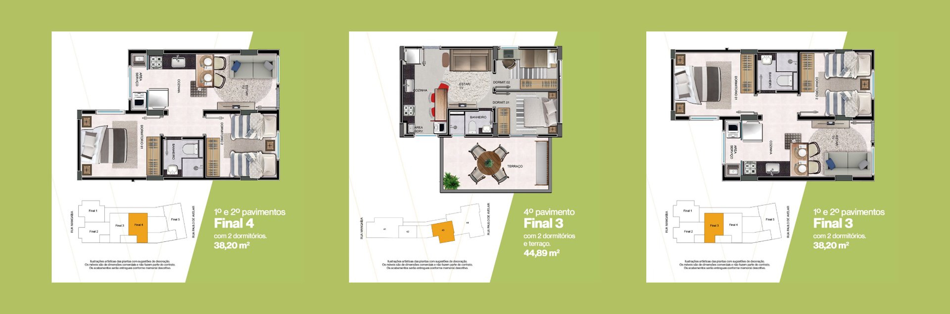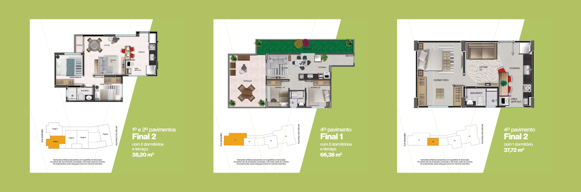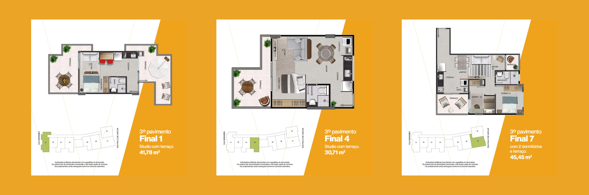 Studios, 1 e 2 Dormitórios com opção de terraço ou sacada, com diversas metragens totais.
