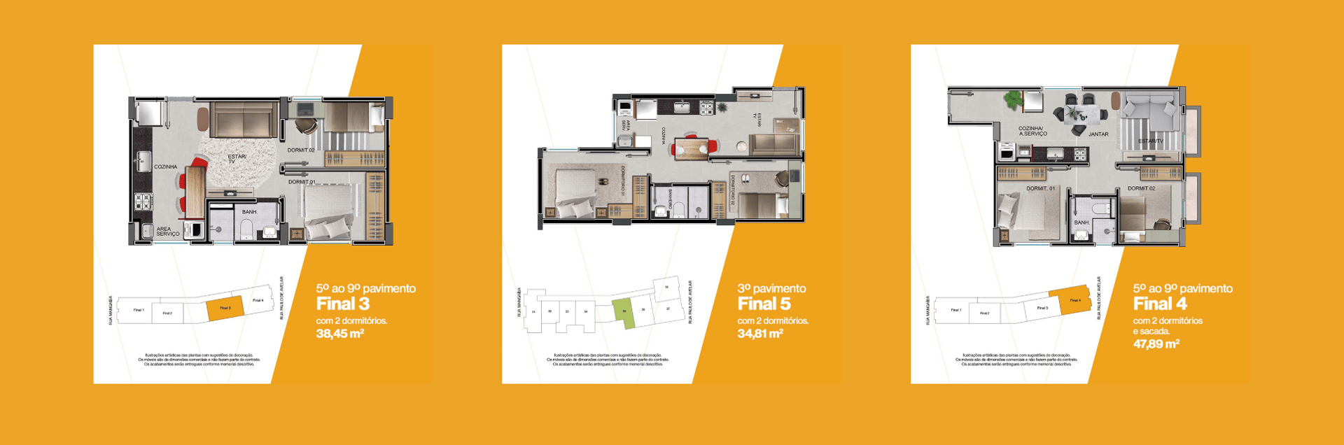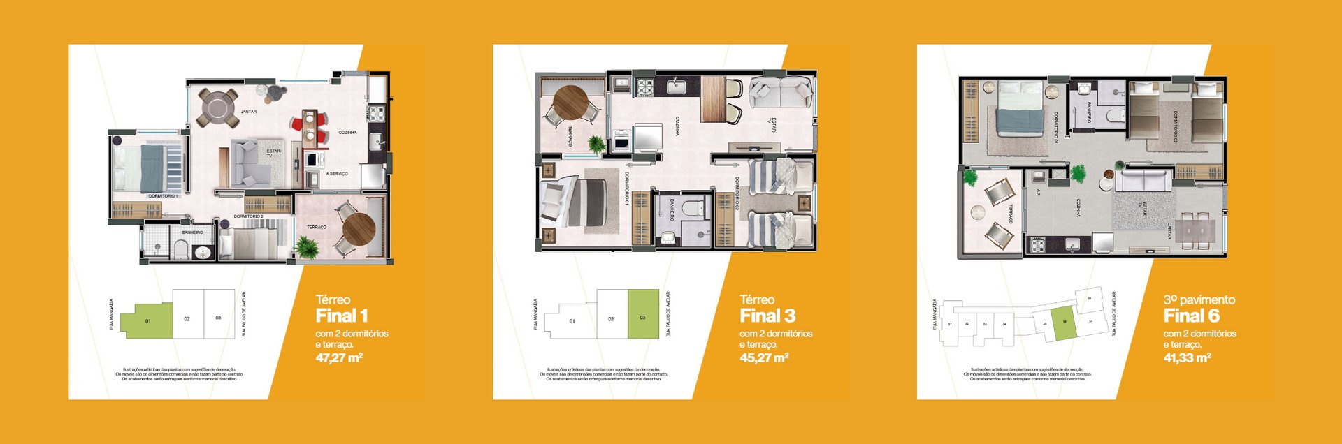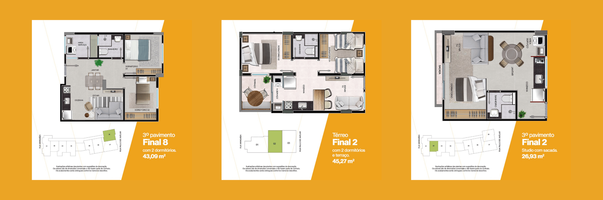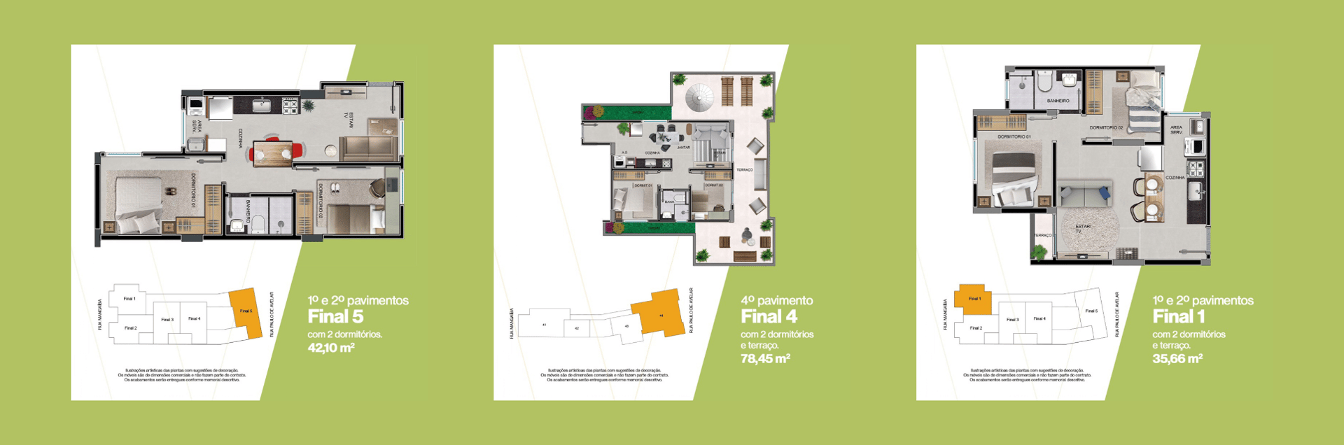 São 45 unidades, com plantas variando entre 25,53m² a 78,45m², com alternativas de 1 e 2 dormitórios com opção de garden e terraço, além de estúdios com terraço em plantas inteligentes com excelente distribuição de espaço.